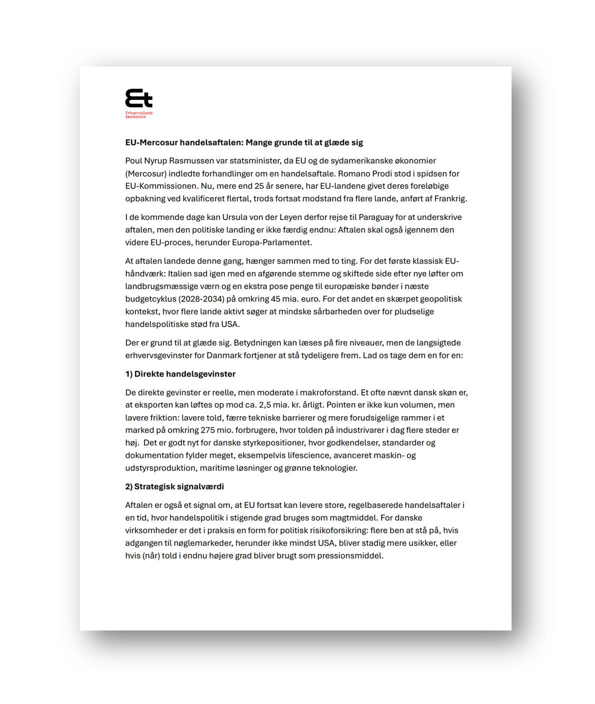 Geopolitik og sikkerhed Danske virksomheders konkurrenceevne, globale risici, forsvar, eksterne trusler. 2026 Når handel bliver geopolitik, bliver Europa en vækststrategi Læs analysen EU-Mercosur handelsaftalen: Mange grunde til at glæde sig Læs analysen 2025 Energi og Klima i 2025 - konkurrenceevne, forsyningssikkerhed og dekarbonisering Læs rapporten Vejen til et økonomisk bæredygtigt Grønland Læs analysen 2023 Dansk erhvervsliv skal bidrage til udviklingen af Danmarks forsvar Læs analysen USA er nu klart det mest værdifulde marked for dansk erhvervsliv Læs analysen 2022 EU's eksport til Rusland er halveret efter invasionen i februar Læs analysen Vi halter bagud ift. udenlandsk arbejdskraft Læs analysen Danske virksomheder investerer mindre i Kina og mere i resten af Asien Læs analysen Kinas betydning for dansk erhvervsliv Læs analysen Kina tager markedsandele i vores nærområdet Læs analysen Globale handelsstrømme vender tilbage til normalen efter corona Læs analysen Europæisk solidaritetsforpligtelse kan sende dansk gas til Tyskland Læs analysen Ukrainske flygtninge strømmer til Danmark - hvad kan vi lære af syrienskrisen ift. integration på arbejdsmarkedet? Læs analysen 2021 Amazon i Norden: Sådan skaber vi lige konkurrence Læs analysen EU foreslår store ændringer til CO2-kvotesystemet Læs analysen EU's CO2-kvotepris på himmelflugt Læs analysen Den europæiske energikrimi - var det vejret, Putin, den grønne omstilling eller A-kraftens skyld? Læs analysen Coronakrisen sætter en brat stopper for erhvervsindvandringen Læs analysen Ingen tegn på regionalisering af verdenshandlen Læs analysen USA og EU i klimakapløb - men begge får svært ved at nå målene Læs analysen 2020 Nu kommer anden bølge af coronakrisens handelsrestriktioner Læs analysen Trump eller Biden - så meget er på spil for Danmark Læs analysen Coronakrisen har fået egoismen frem i handelspolitikken Læs analysen 2019 Globaliseringens bidrag til dansk økonomi er faldet til det laveste de sidste 50 år Læs analysen
