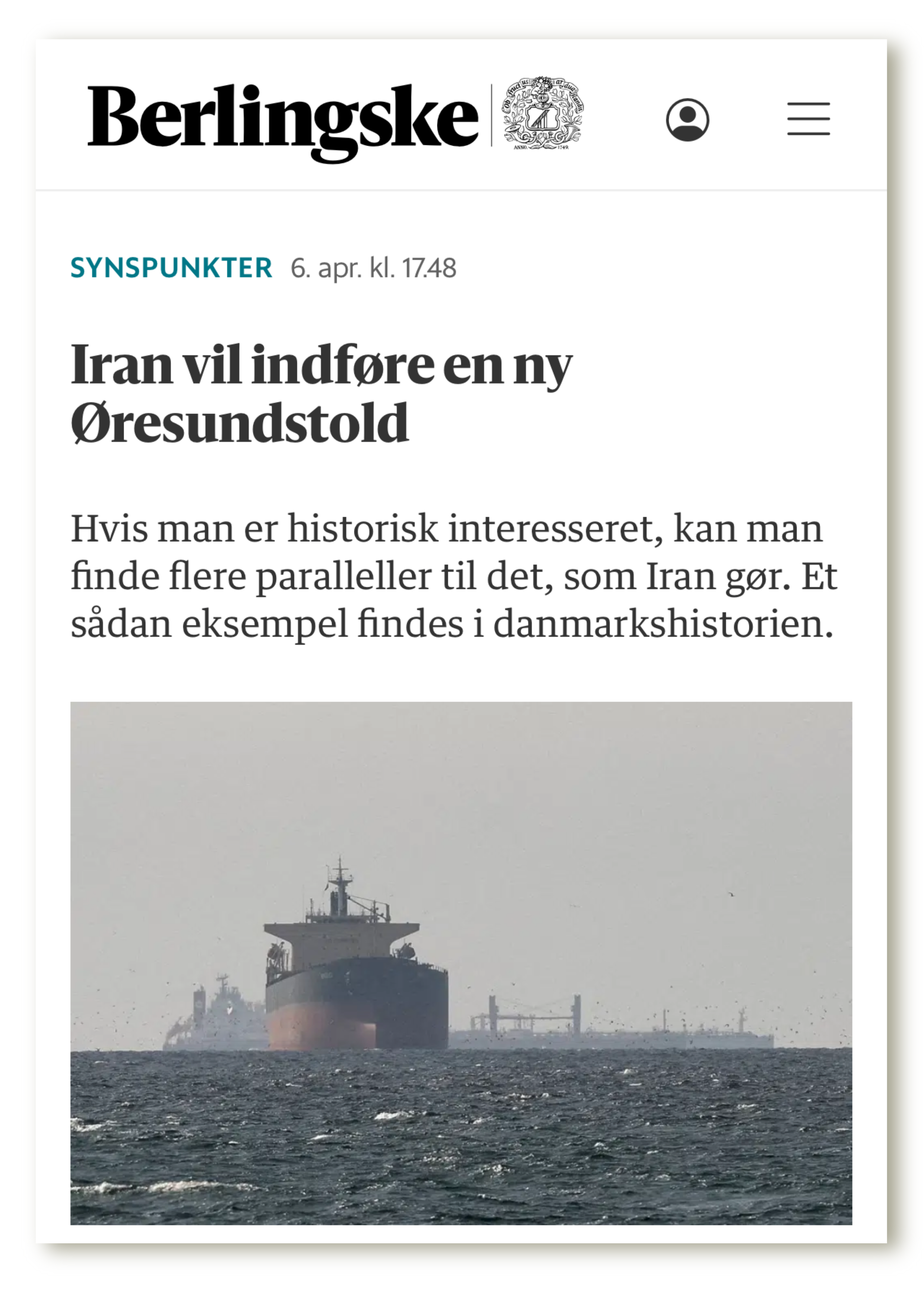 Hvis man er historisk interesseret, kan man finde flere paralleller til det, Iran gør. Et sådant eksempel findes i Danmarkshistorien. Allerede i 1400-tallet begyndt danske konger i pengenød at opkræve en Øresundstold af skibe, der sejlede midt gennem det danske rige i Øresund. Ved Kronborg er Øresund mindre end 5 km bred, og det var derfor nemt at ramme skibe, der ville undslippe tolden, med kanonkugler.